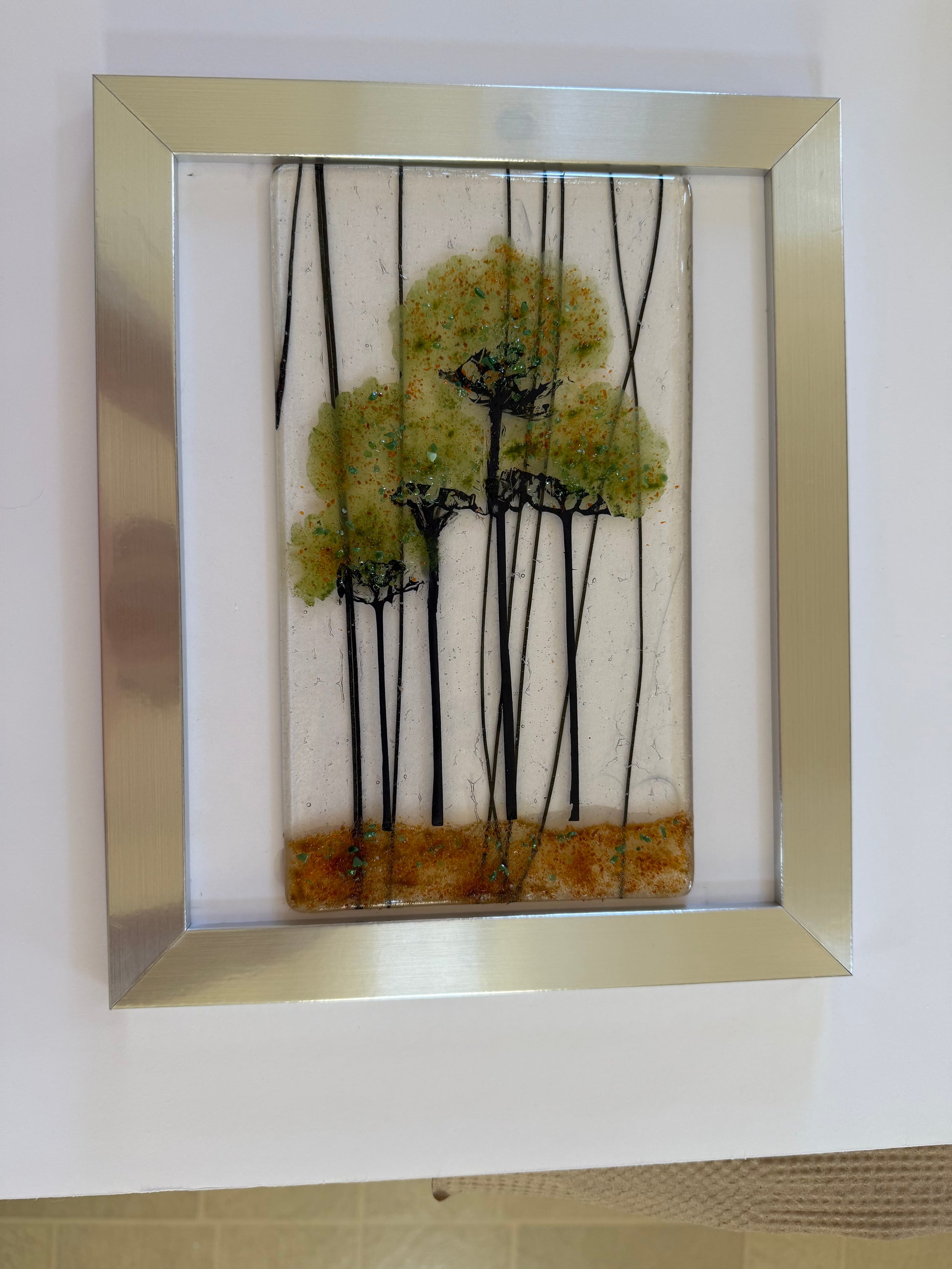 This handcrafted artwork is a striking piece created with fused glass, encased in a sleek, metallic silver frame. The glass panel features an abstract depiction of tall, slender black tree trunks stretching vertically, with minimalistic, textured green foliage clustered towards the tops, evoking a forest scene. The ground is represented with a blend of warm amber and orange hues, adding earthy warmth. The glass surface has slight textural variations, enhancing the depth and natural feel of the piece. The combination of transparent and opaque elements, along with the linear design, gives it a modern, yet organic aesthetic.