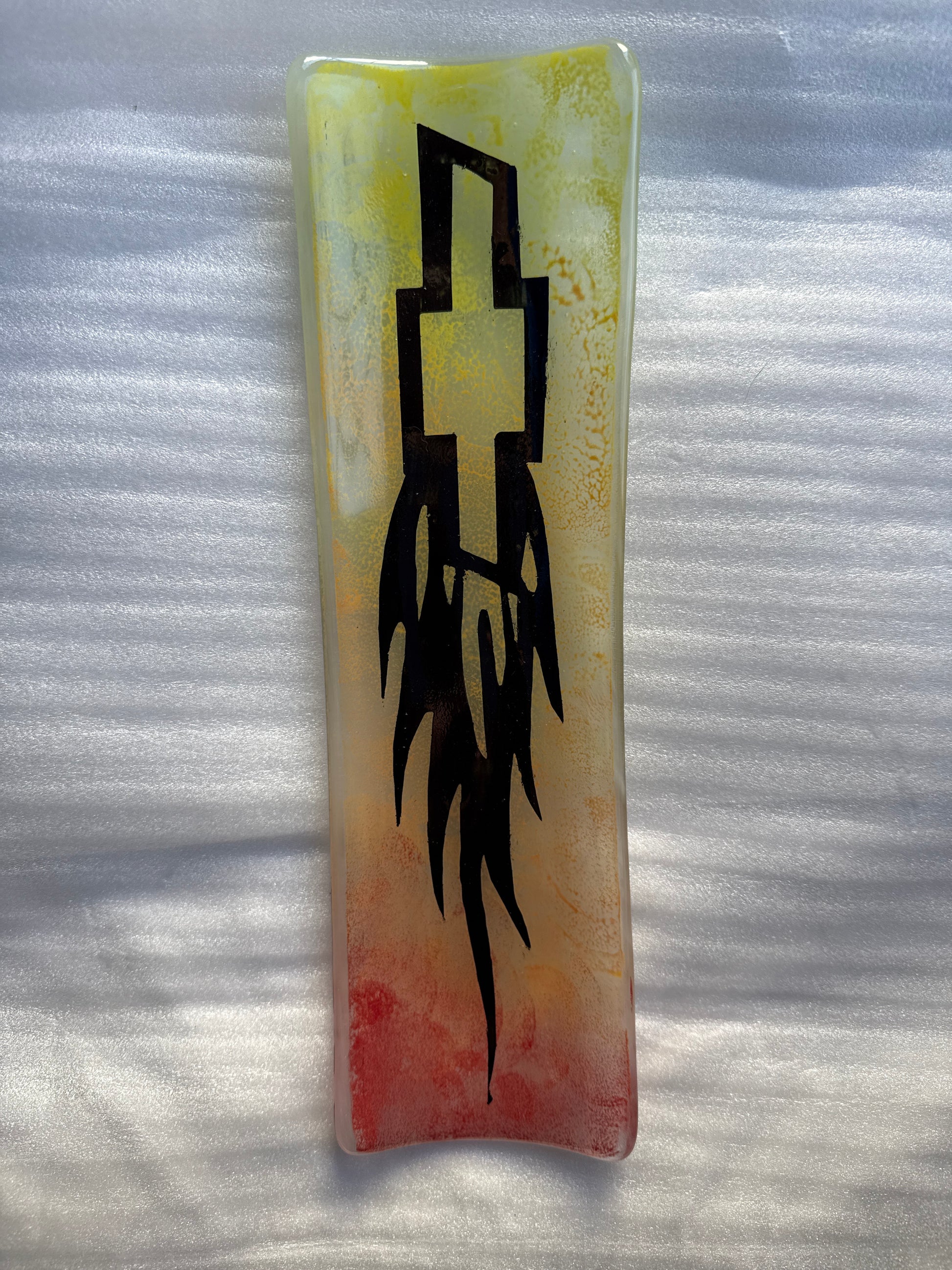 This handmade fused glass channel plate measures 12 inches by 3.75 inches, showcasing a sleek and modern design. Crafted with precision, its smooth, glossy surface highlights a prominently featured Chevy emblem, making it a standout piece. The emblem is expertly integrated into the glass, reflecting the iconic Chevrolet style. Ideal for any Chevrolet enthusiast, this decorative plate adds a touch of automotive charm to any space, whether displayed on a shelf, desk, or as part of a collection.