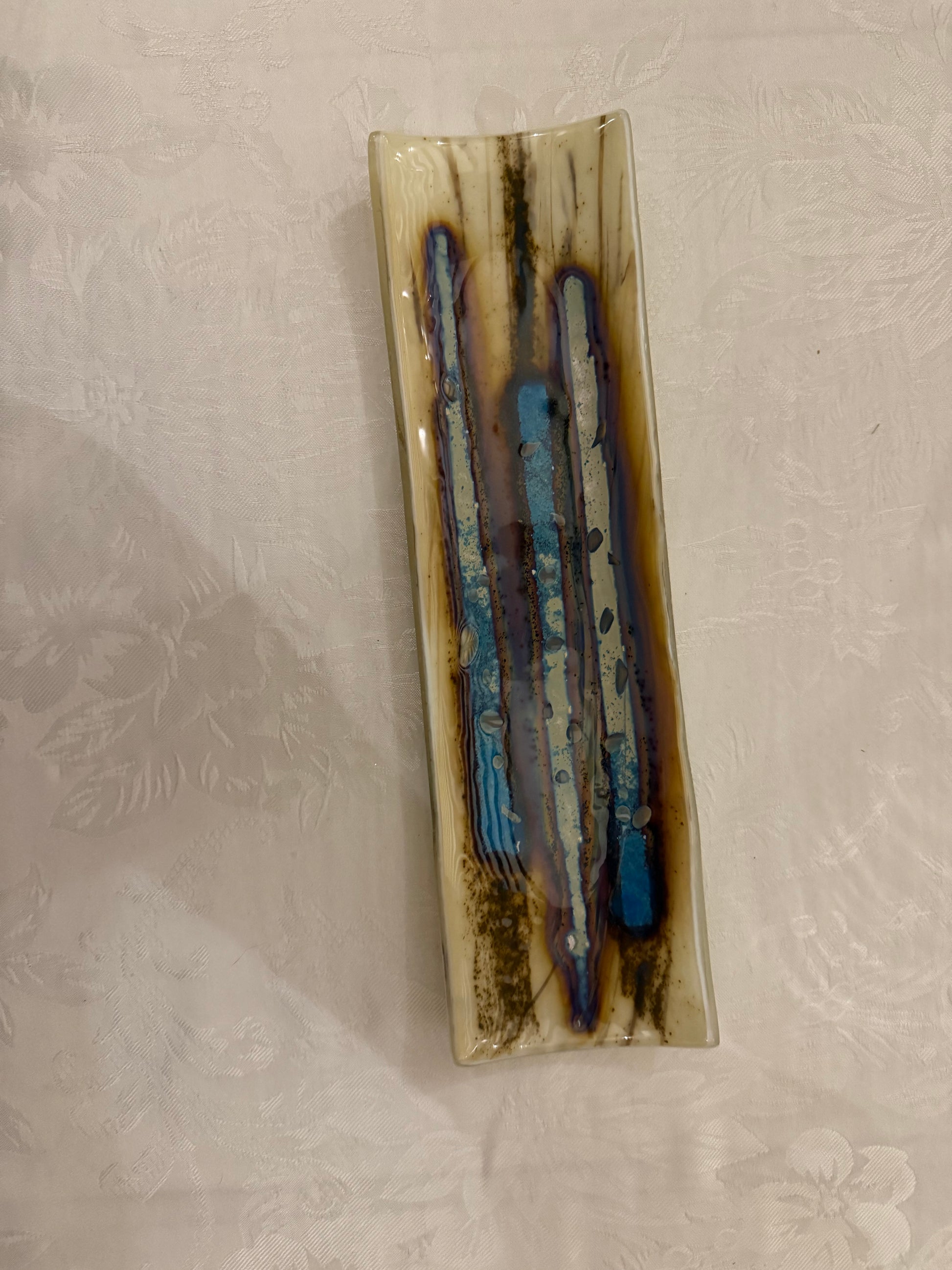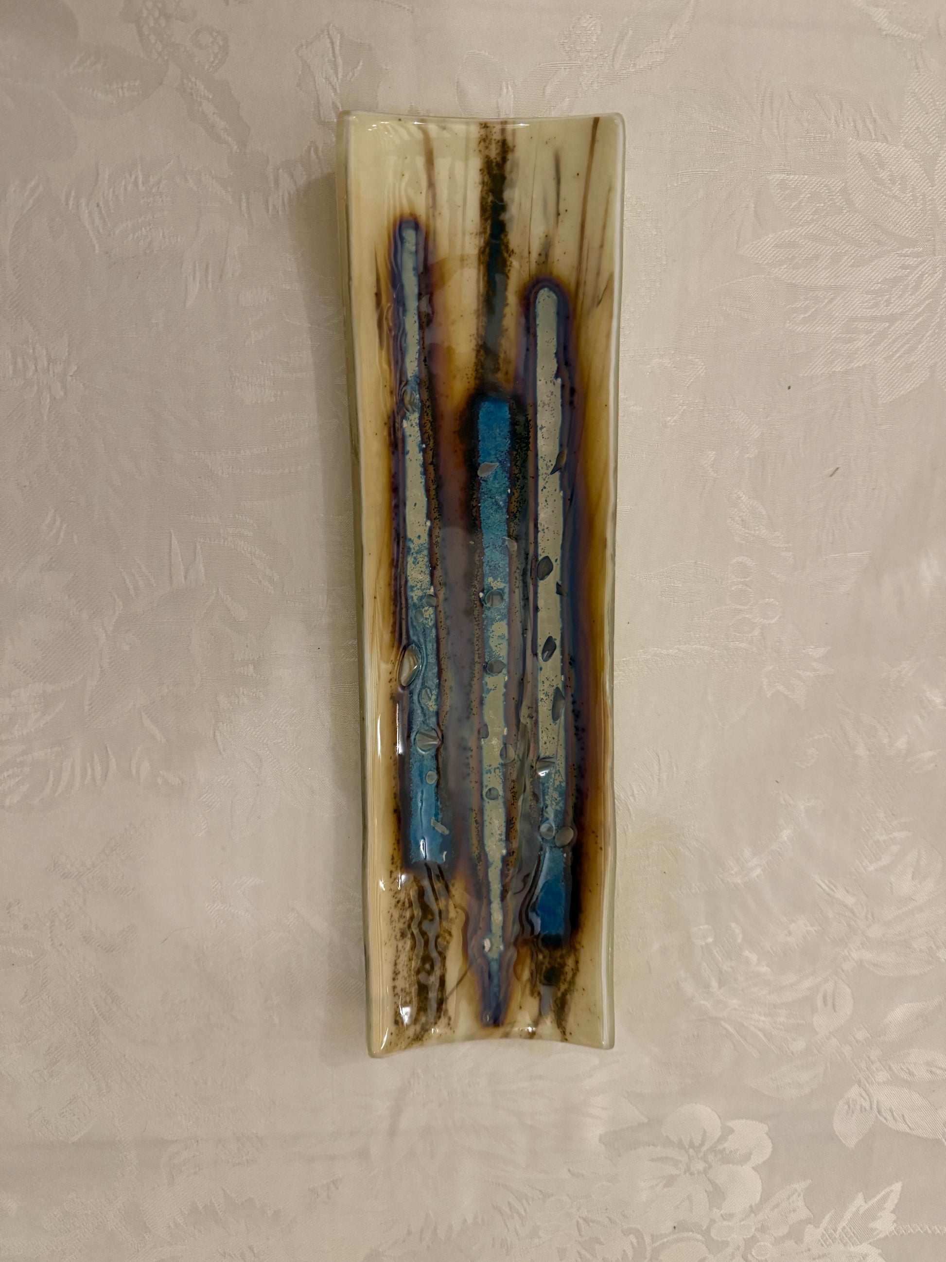 This stunning fused glass plate showcase an exquisite blend of artistry and chemistry. The 12” x 3-3/4” rectangular plate features a creamy, marble-like base with subtle brown and beige streaks, creating a natural, earthy backdrop. Bold vertical accents in radiant shades of blue and metallic silver dominate the design, with the colors transitioning beautifully due to chemical reactions during the fusing process. This reaction results in mesmerizing halos of purples, browns, and hints of iridescence around the blue and metallic elements, adding depth and texture. The plate has a gentle curve, enhancing their modern aesthetic while maintaining a functional elegance.