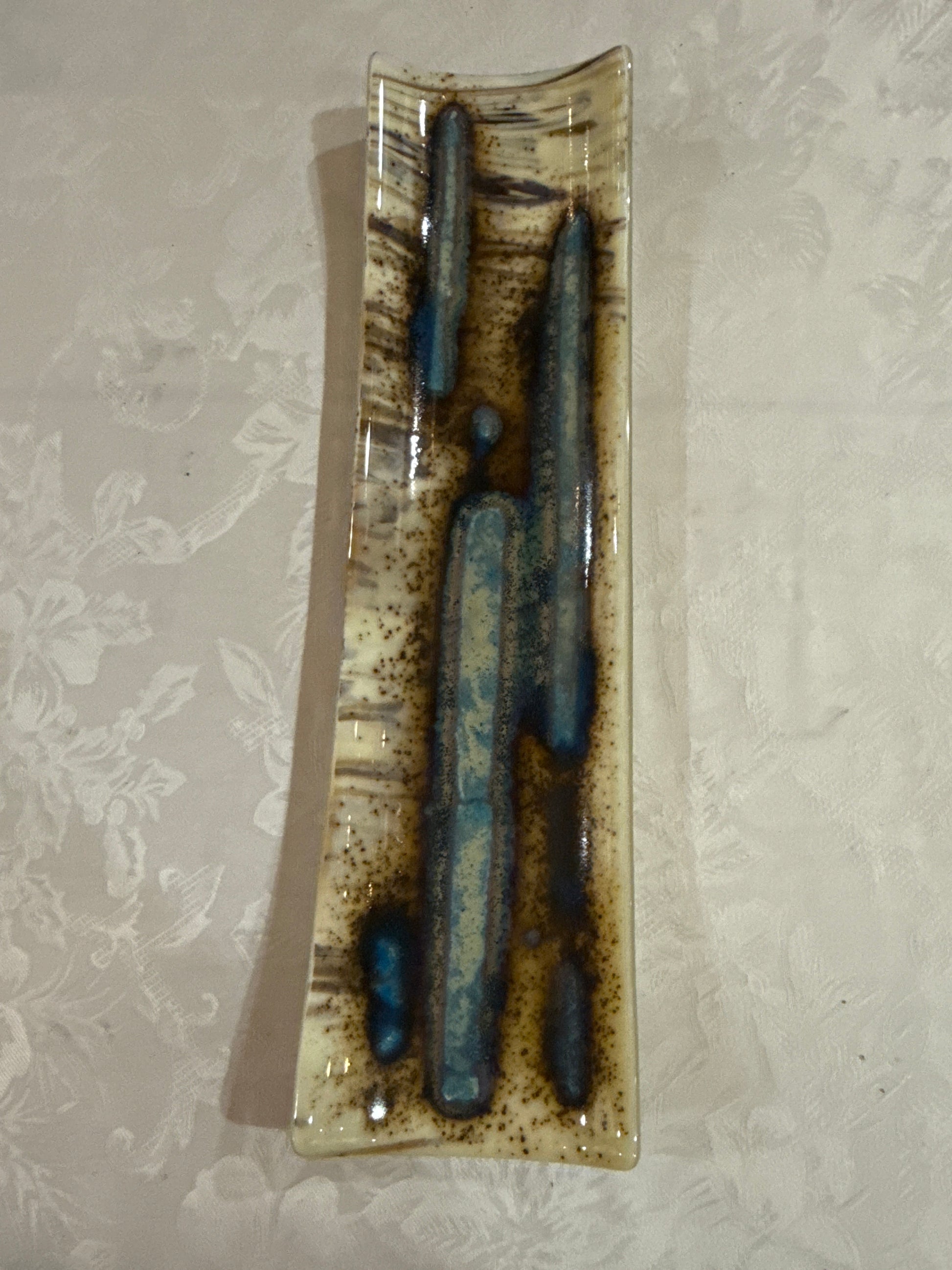 The platter showcases a striking blend of earthy tones with prominent blue streaks accented by a silver touch, achieved by a chemical reaction with silver foil copper and sulfur glass resulting in a sophisticated and modern aesthetic.