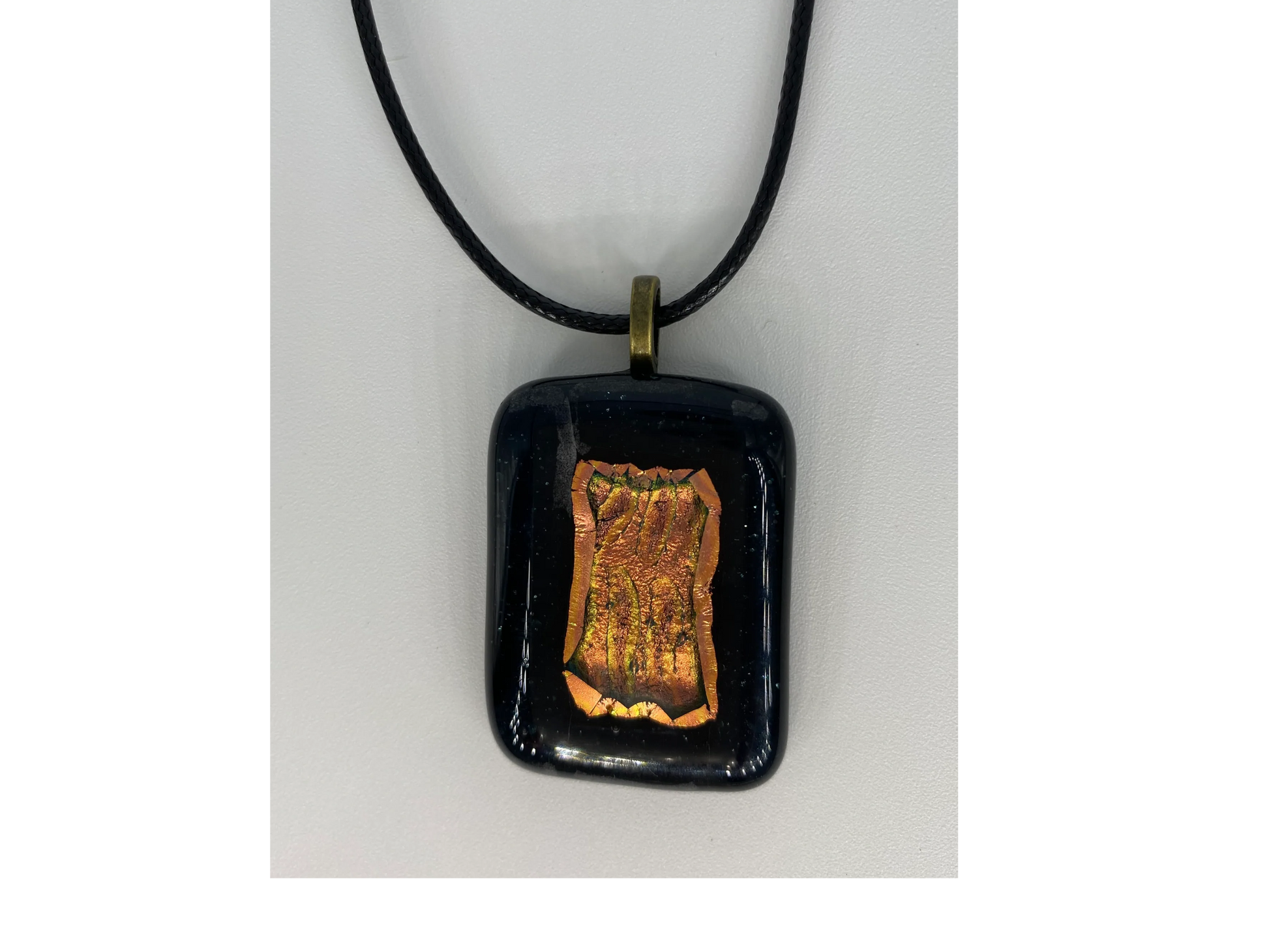 Introducing the Sunken Gold Pendant, a captivating masterpiece from our galleries. Crafted with precision, this black and gold glass necklace features a small square of gold that appears to be buried deep beneath the surface. This is truly a unique piece of art.