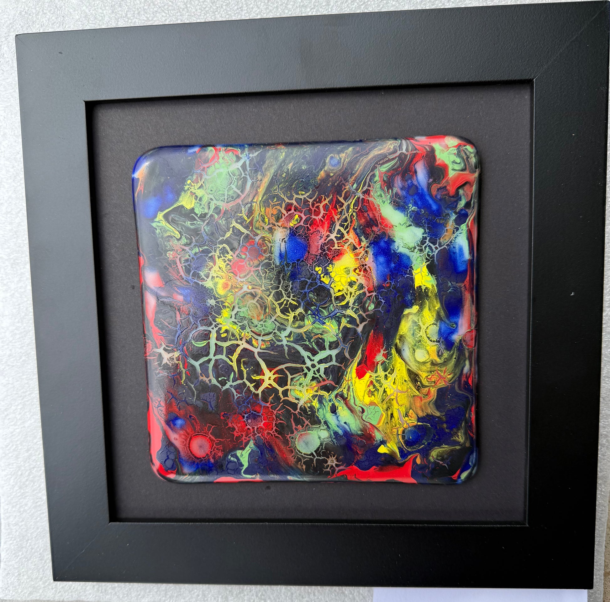 This striking framed fused glass artwork measures 9 x 9 inches, featuring a vibrant array of colors in an abstract design. Swirls of bold red, deep blue, bright yellow, green, and hints of black create dynamic, web-like patterns with intricate details and textures. The glass has a glossy finish that enhances the depth and vibrancy of the colors. It is set against a matte black background within a sleek black frame, which adds a modern touch and draws attention to the vivid glass centerpiece.